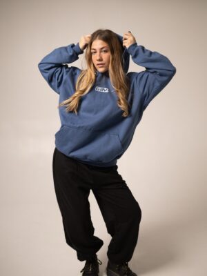 Buzo Frizado Oversize azul, su corte moderno y extra grande. Este cuenta con rib en puños y cintura. El rib es un tejido acanalado y elástico, ayuda a que las prendas mantenga su forma con el tiempo, evita que entre el frío o que la prenda quede suelta.